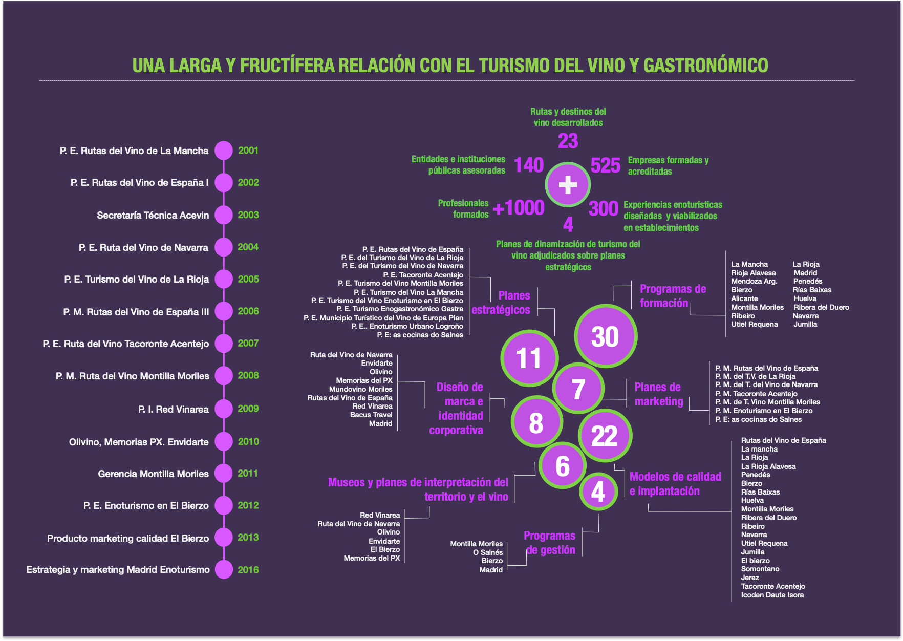 análisis estratégico, ordenación y planificación territorial, procesos de concertación y gobernanza, comunicación integral, soluciones tecnológicas, desarrollo de mercados y el diseño de experiencias únicas.